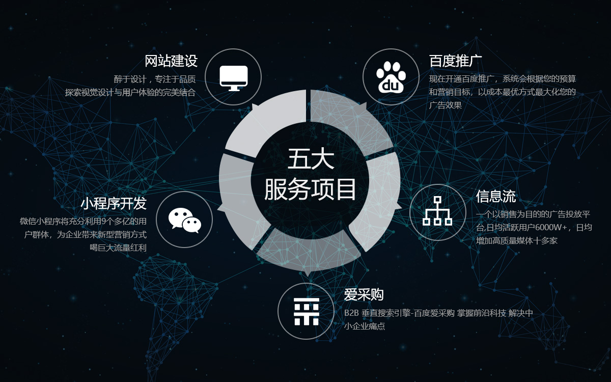 集團(tuán)以為企業(yè)提供最完善、最有效的網(wǎng)絡(luò)營銷策劃方案為使命,目前擁有九家全資分公司,囊括電子、機(jī)械等在內(nèi)的 37個(gè)一級(jí)行業(yè)和201個(gè)二級(jí)行業(yè)。業(yè)務(wù)覆蓋青島、濟(jì)南、煙臺(tái)、濰坊、威海、日照、臨沂等山東半島,經(jīng)營業(yè)務(wù)主要有搜索推廣、直通車、糯米、信息流、全景地圖、金融、滴滴打車、網(wǎng)絡(luò)增值、瑞思英語九大模塊,是搜索、糯米、金融、滴滴打車等互聯(lián)網(wǎng)企業(yè)在山東半島的獨(dú)家運(yùn)營商與合作伙伴。